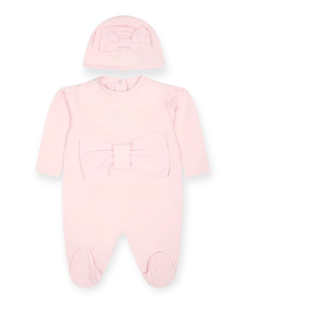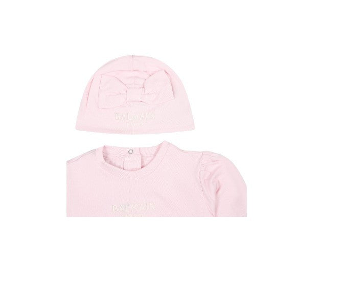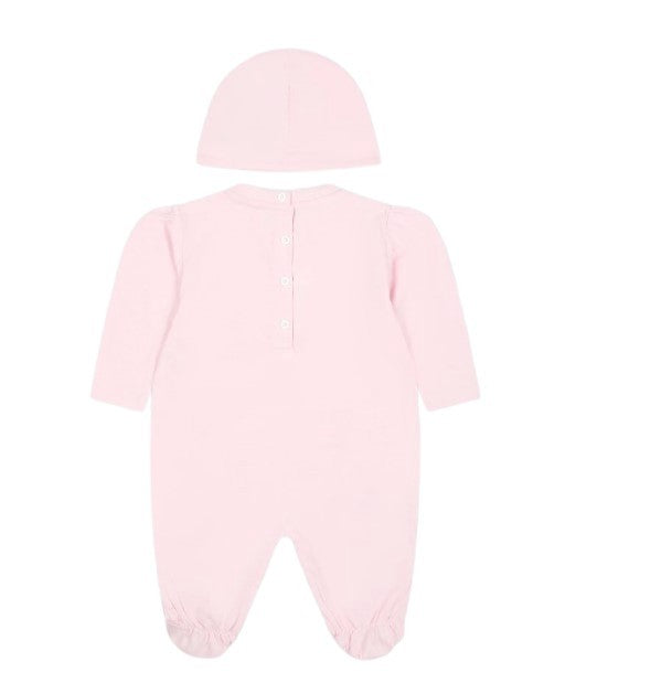 Tutina rosa in cotone, girocollo, maniche lunghe, chiusura con ganci a pressione sulla parte posteriore e tra le gambe, piedini. E' decorata con fiocco e logo ricamato sulla parte anteriore. Cappello rosa in cotone. E' decorato con fiocco e logo ricamato sulla parte anteriore.