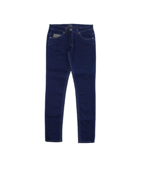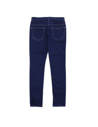 Jeans in denim stretch, chiusura frontale con bottone e zip, modello cinque tasche, logo sul retro.